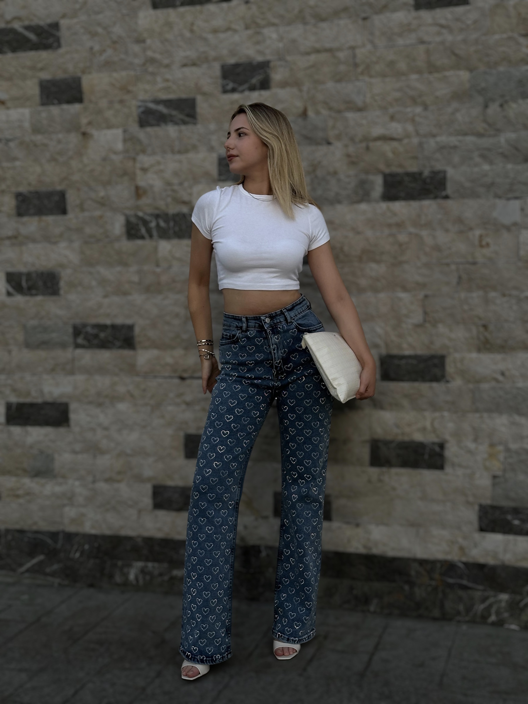 %98 Cotton %2 Elastane Taşlı kalpli palazzo pantolon.